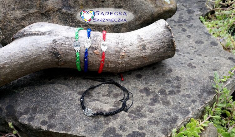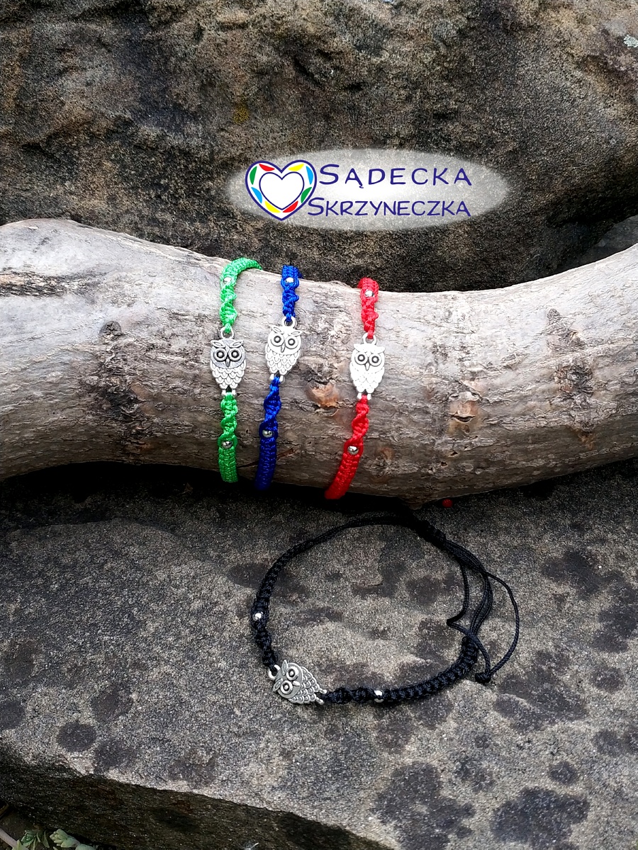 Bransoletka z łącznikiem w kształcie sowy, wykonana ze sznurka 1 mm.