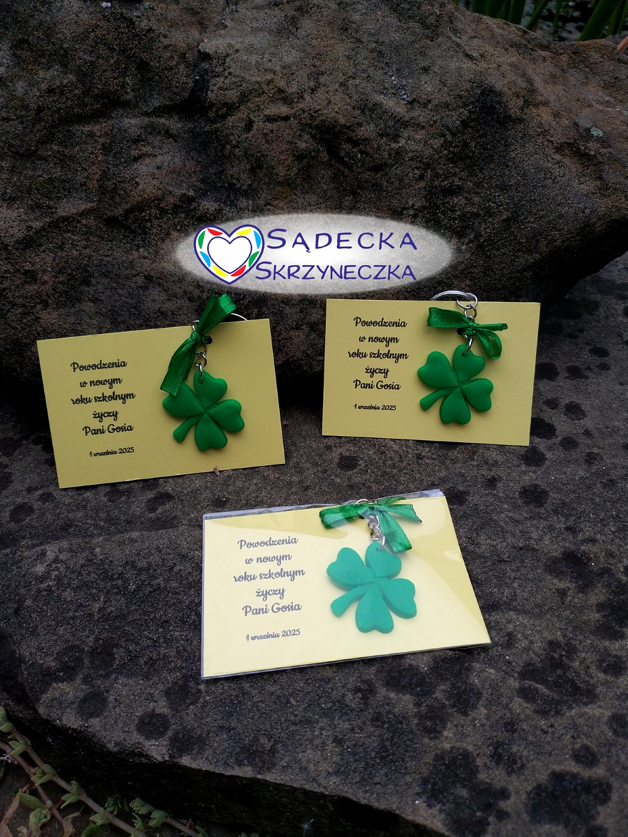 Breloczek silikonowy, jednostronny, koniczyna o wymiarach ok. 3 na 3 cm, długość z łańcuszkiem i koluszkiem ok. 7,5 cm.