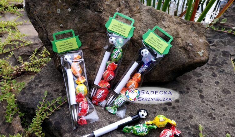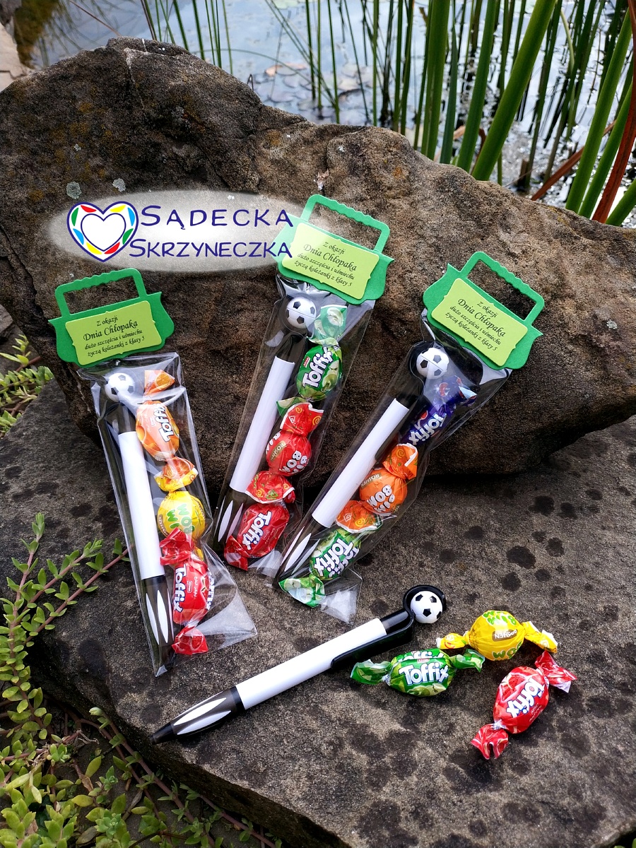 Słodko-piśmienne pakieciki na Dzień Chłopaka 2 września 20252 września 2025Dorota Upominek zawiera trzy cukierki (zestaw przykładowy) oraz „piłkarski” długopis (piłka się obraca)