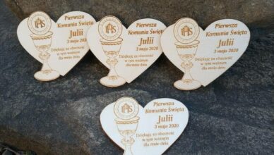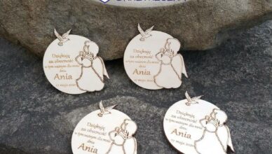 Komunijne magnesy ze sklejki – aniołek Średnica ok. 6,5 cm, grubość sklejki 3 mm, na odwrocie okrągły magnes ferrytowy lub taśma magnetyczna, sklejka