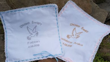 Pamiątkowa, biała szatka na Chrzest Święty. Wykonana z podwójnego płótna bawełnianego (nie widać spodniej strony haftu), ozdobiona bawełnianą koronką oraz satynową wstążeczką. Personalizowany